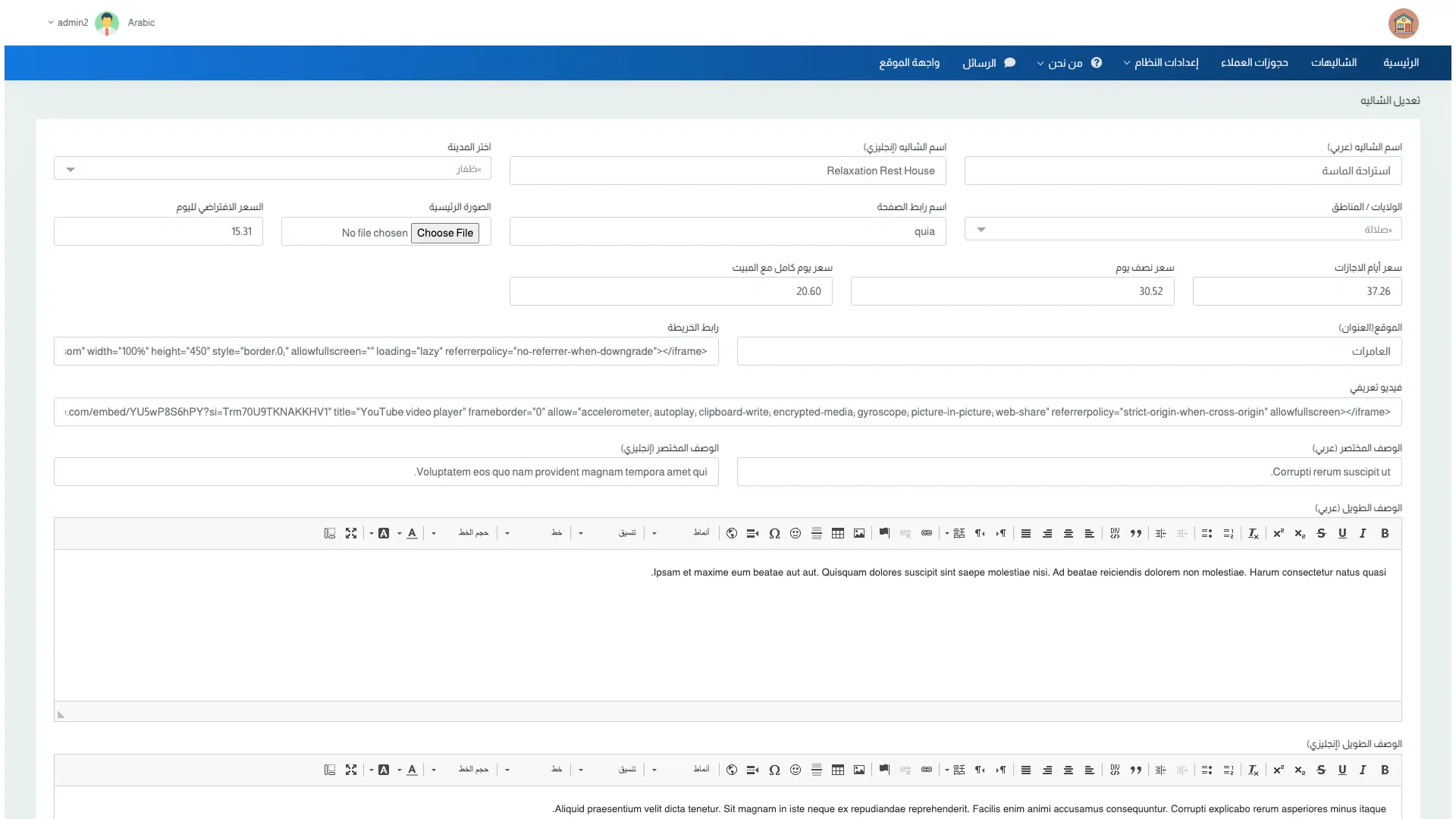 Enables management of multiple chalets and resorts by adding new units with detailed information such as location, pricing, facilities, and number of rooms and bathrooms. Images can also be uploaded for professional display to customers.