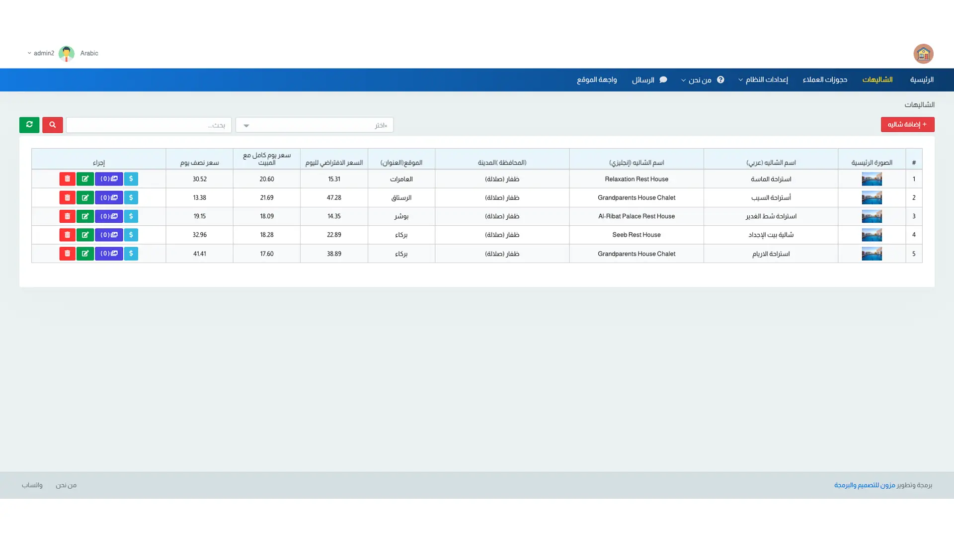 Enables management of multiple chalets and resorts by adding new units with detailed information such as location, pricing, facilities, and number of rooms and bathrooms. Images can also be uploaded for professional display to customers.