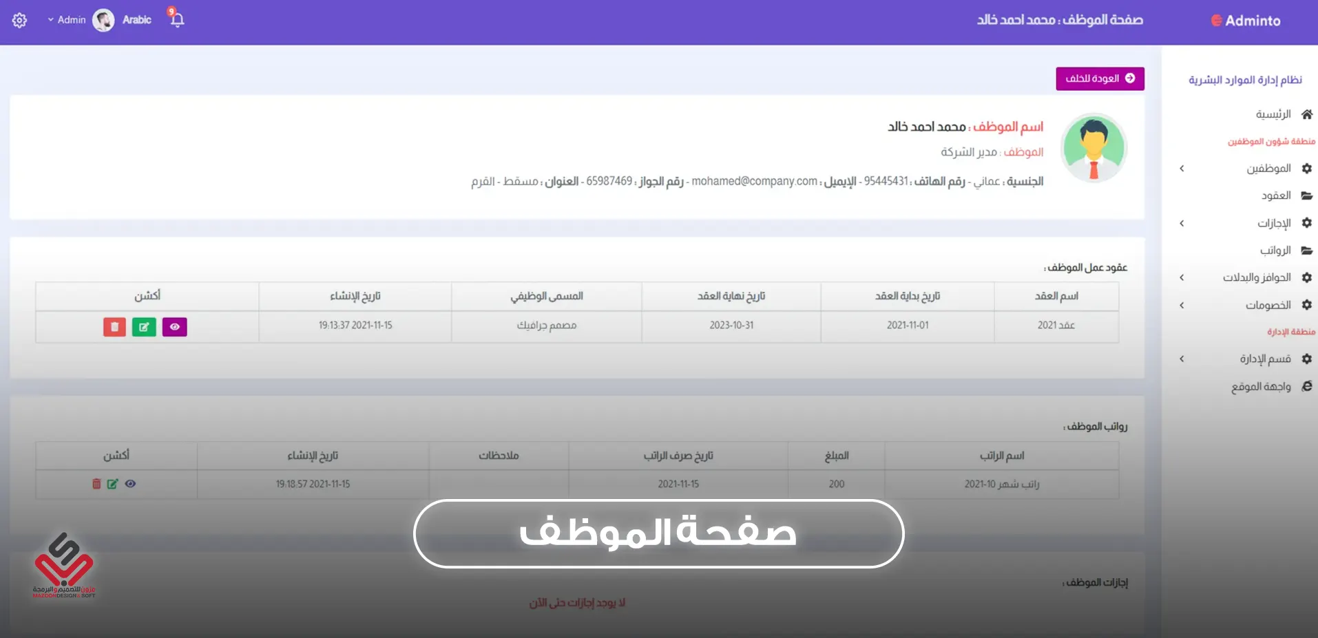 The system supports printing contracts or saving them as PDF files. Employees can also view their contracts through their personal dashboard.