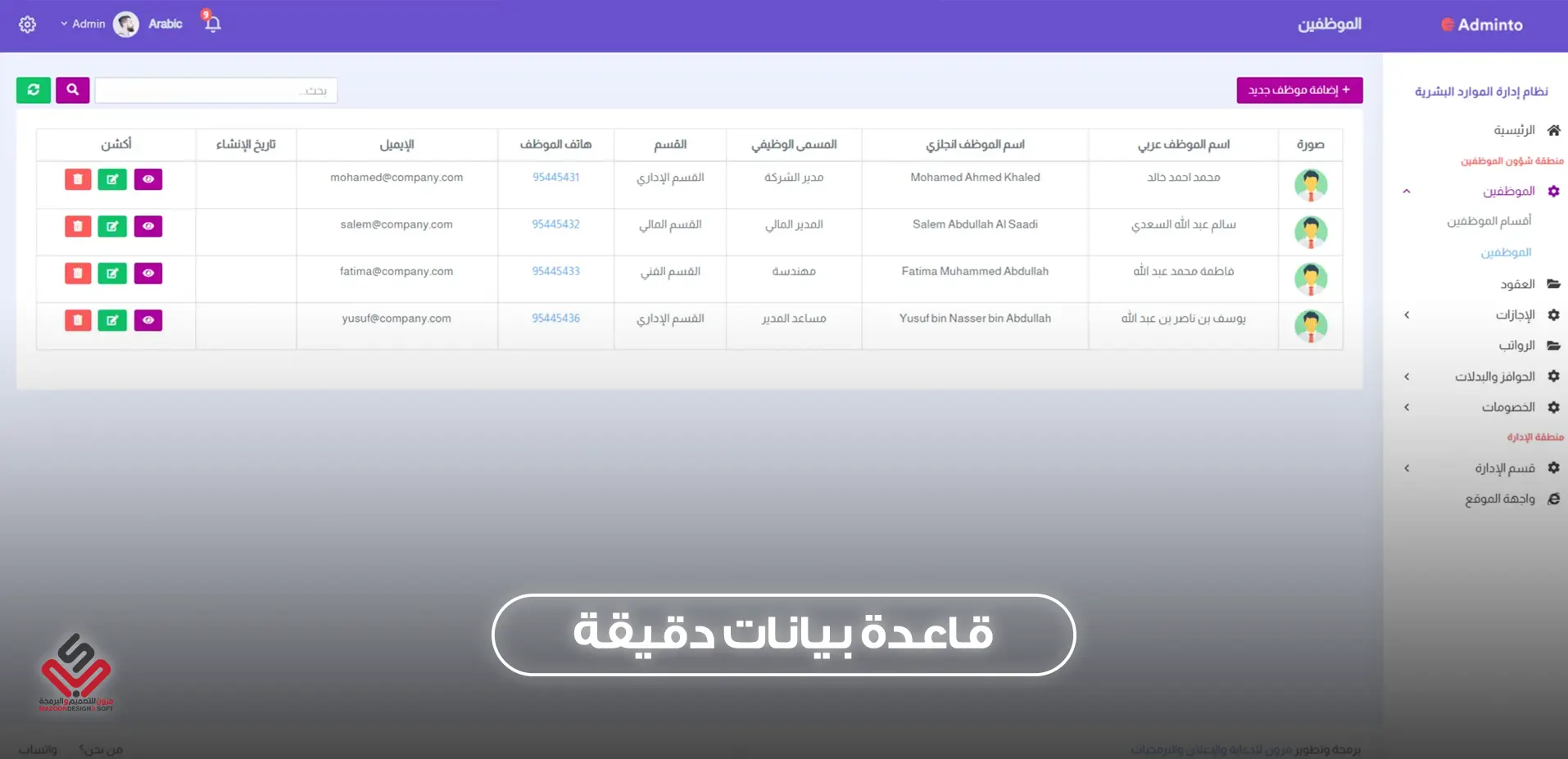 The system allows dividing employees into departments, with the ability to add multiple employees under each department along with their full information, editable at any time.