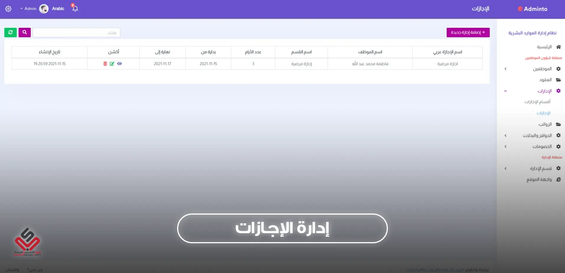 A dedicated section for leaves, including types (annual, sick, emergency), with the ability to register leaves between specific dates and assign a substitute employee.