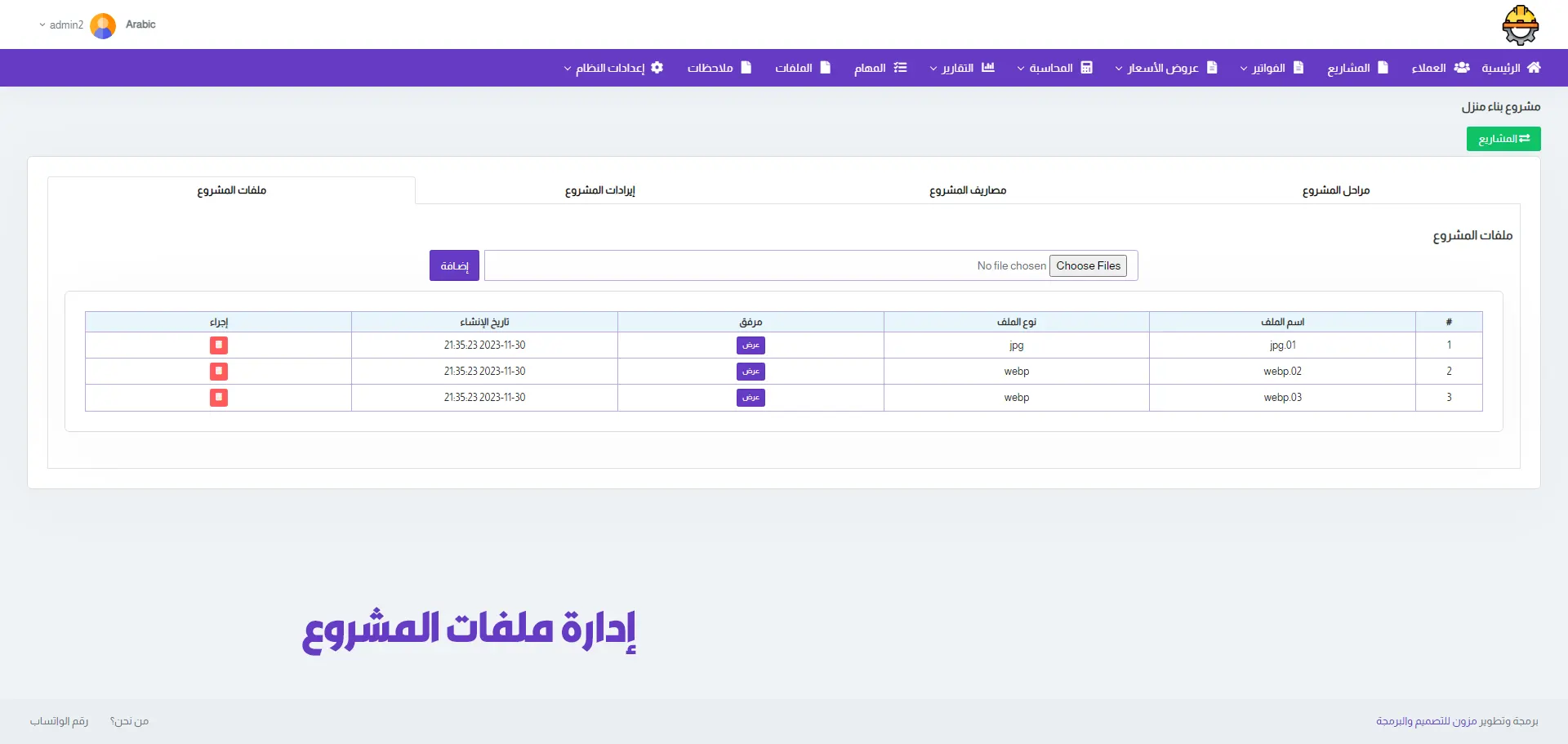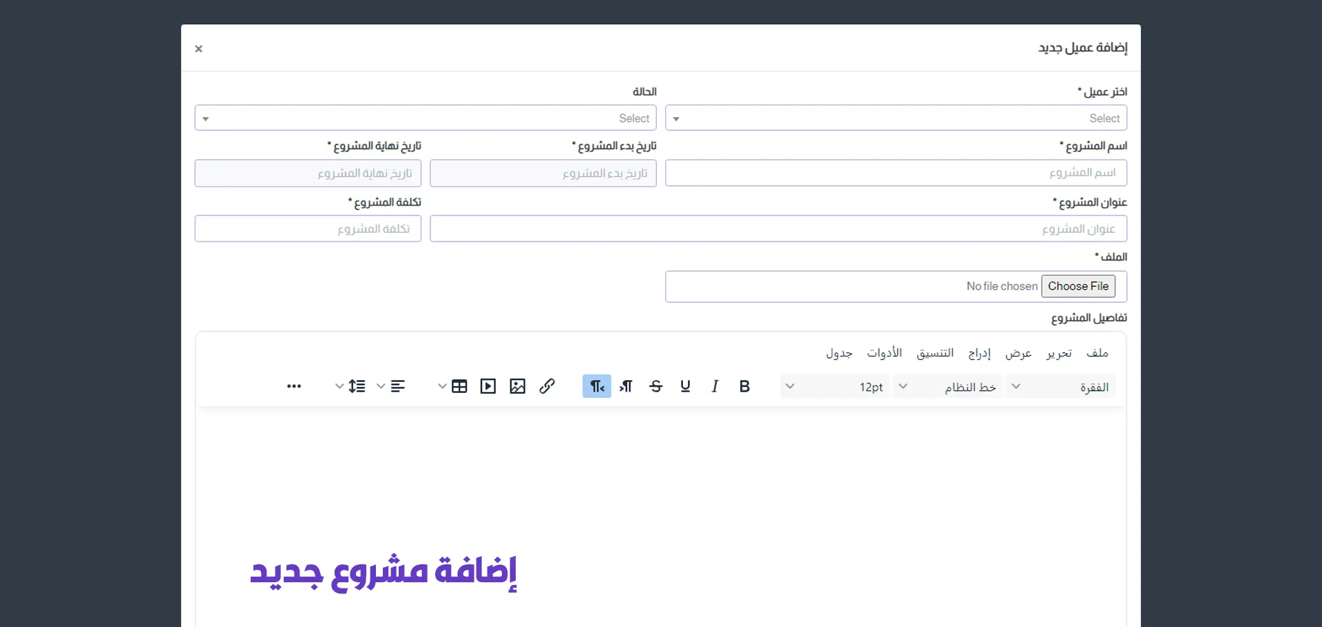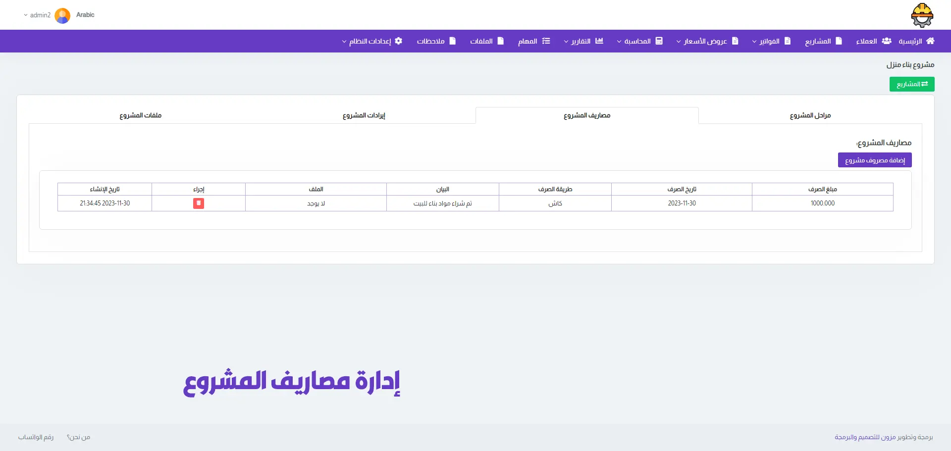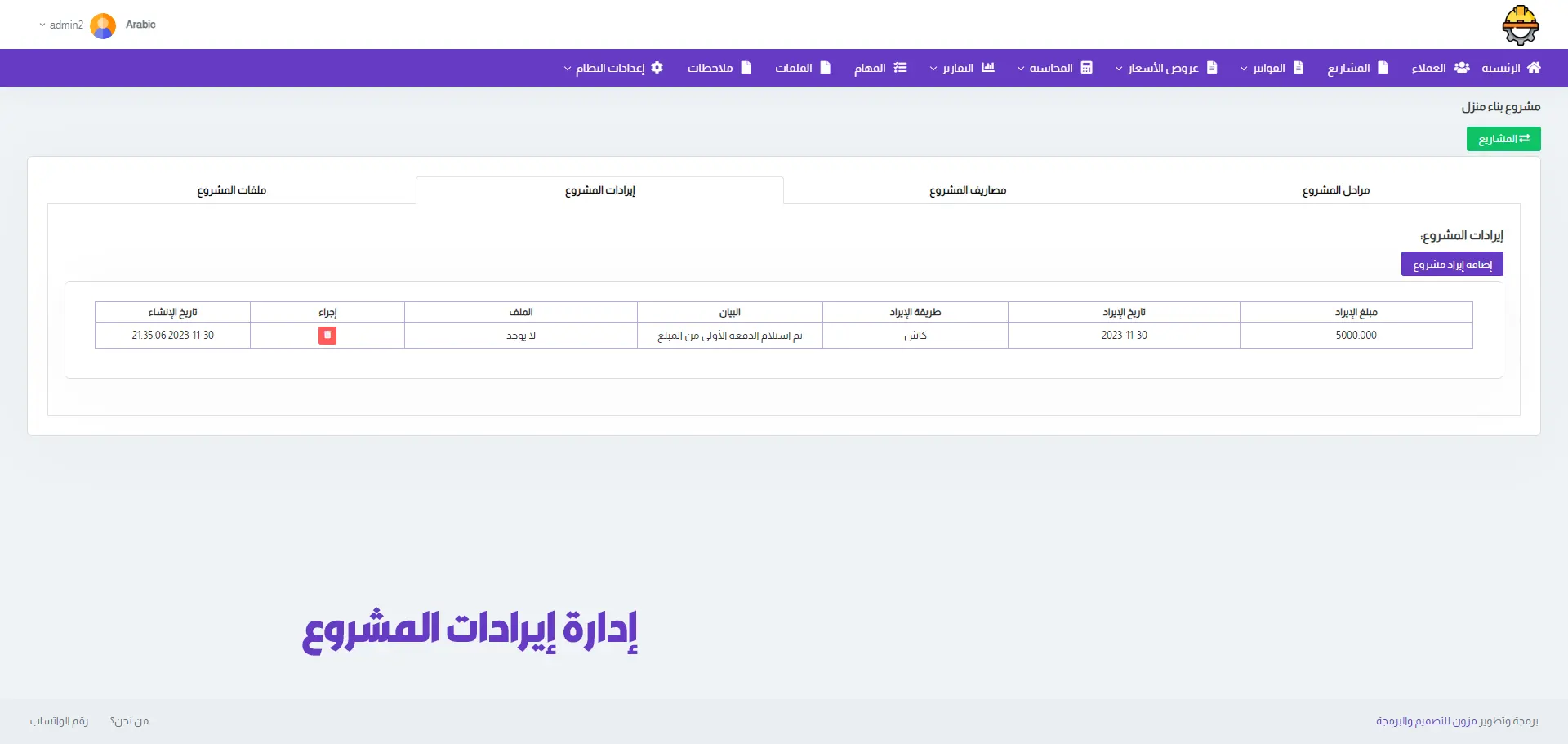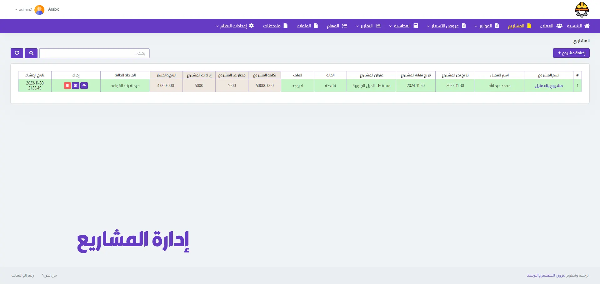 A dedicated section for managing projects, allowing you to add multiple projects, track project value, stages, duration, expenses, and calculate profit & loss.
