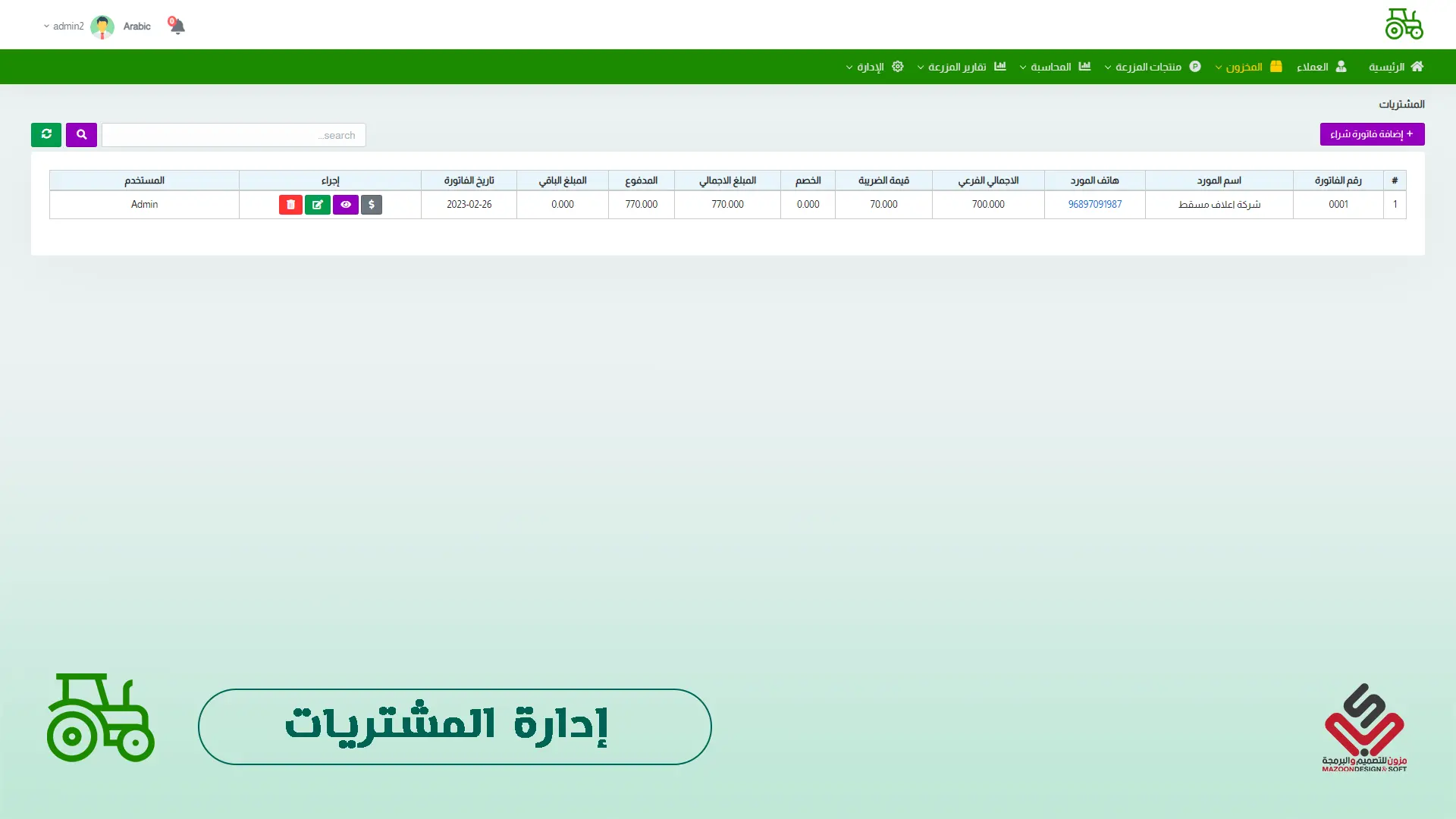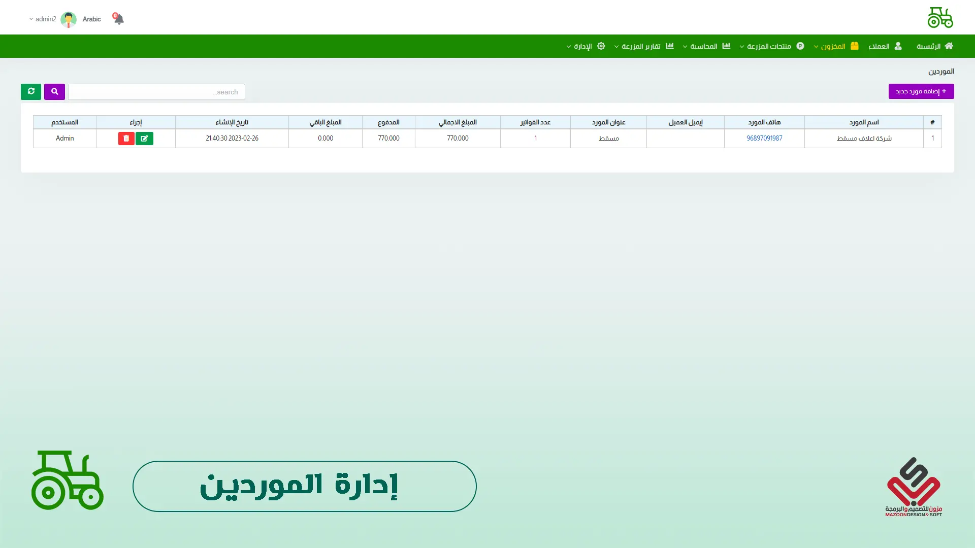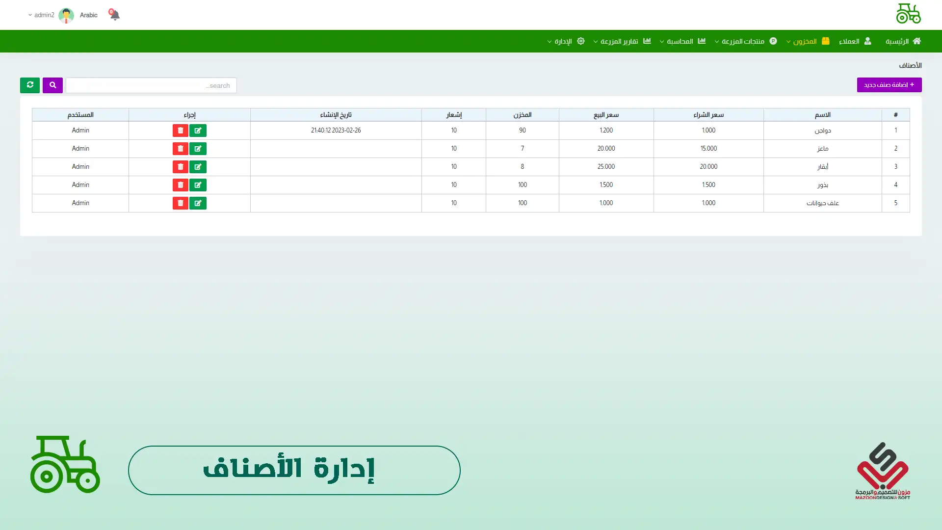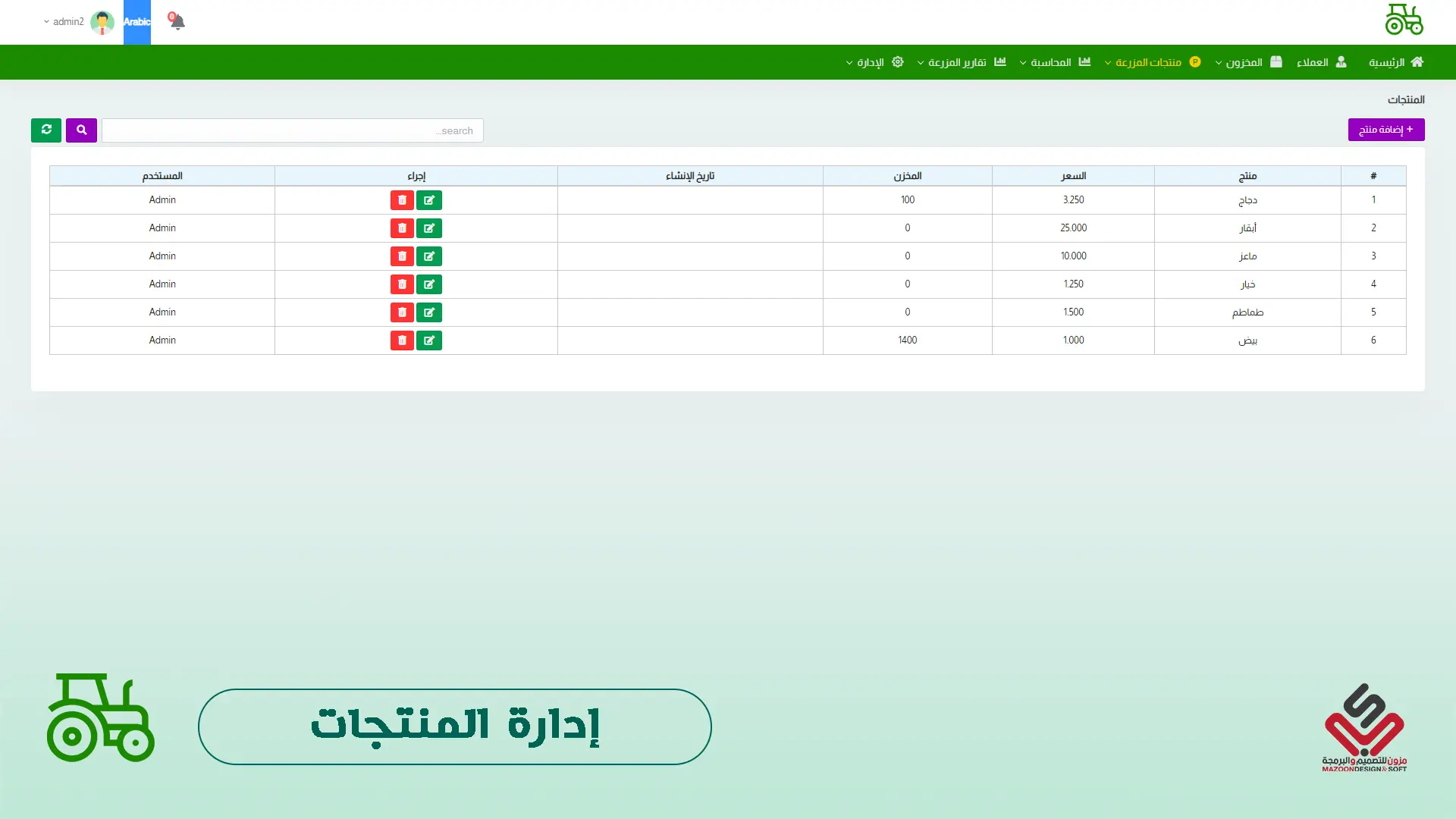 إضافة المنتجات من المزرعة مع الأسعار ، وإضافة مخزون من مشتريات الموردين مع معرفة العدد المتاح وسعر الشراء وسعر البيع مع التنبيهات لعدد معين، والنقص من المخزون في حالة البيع
