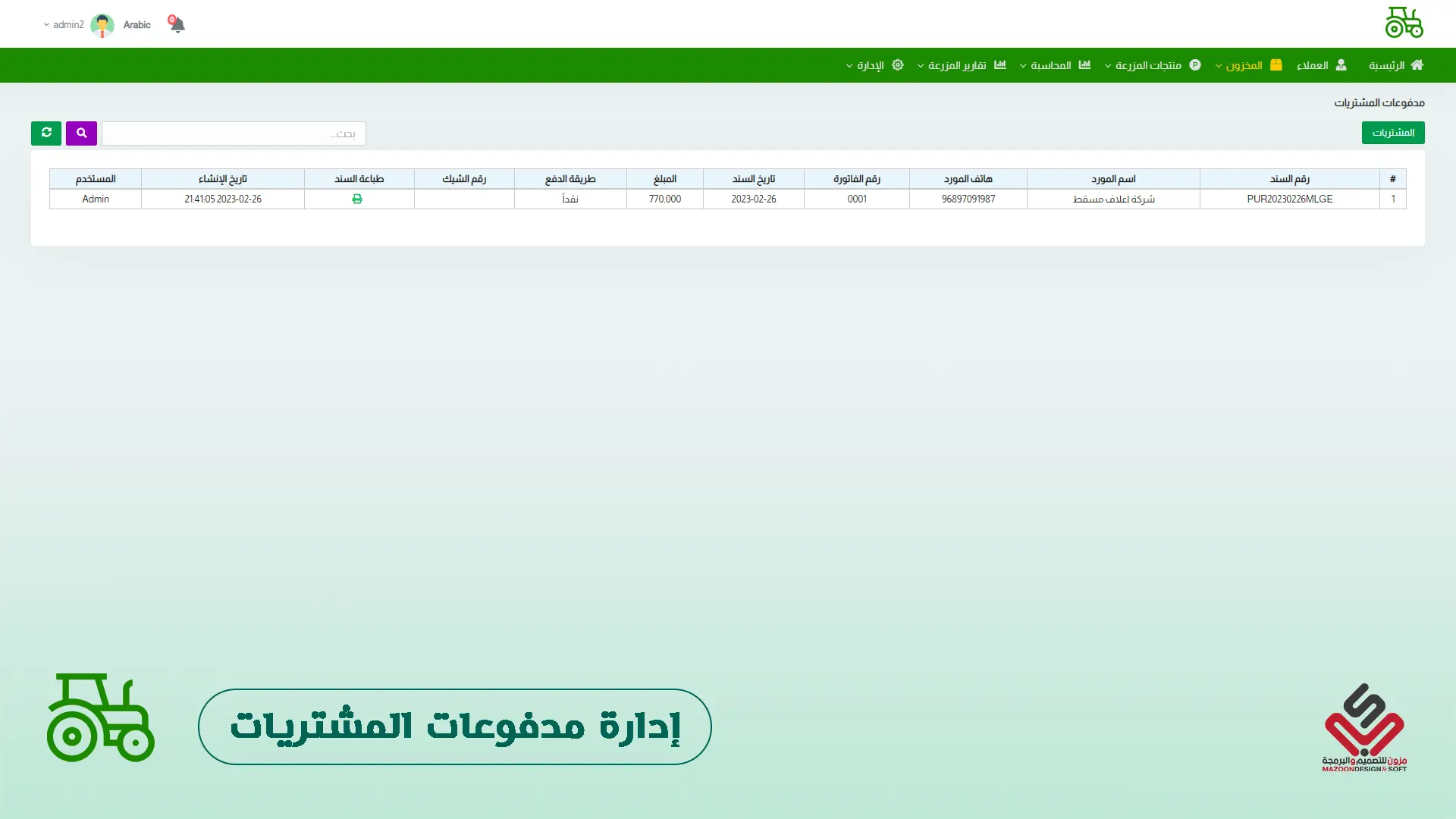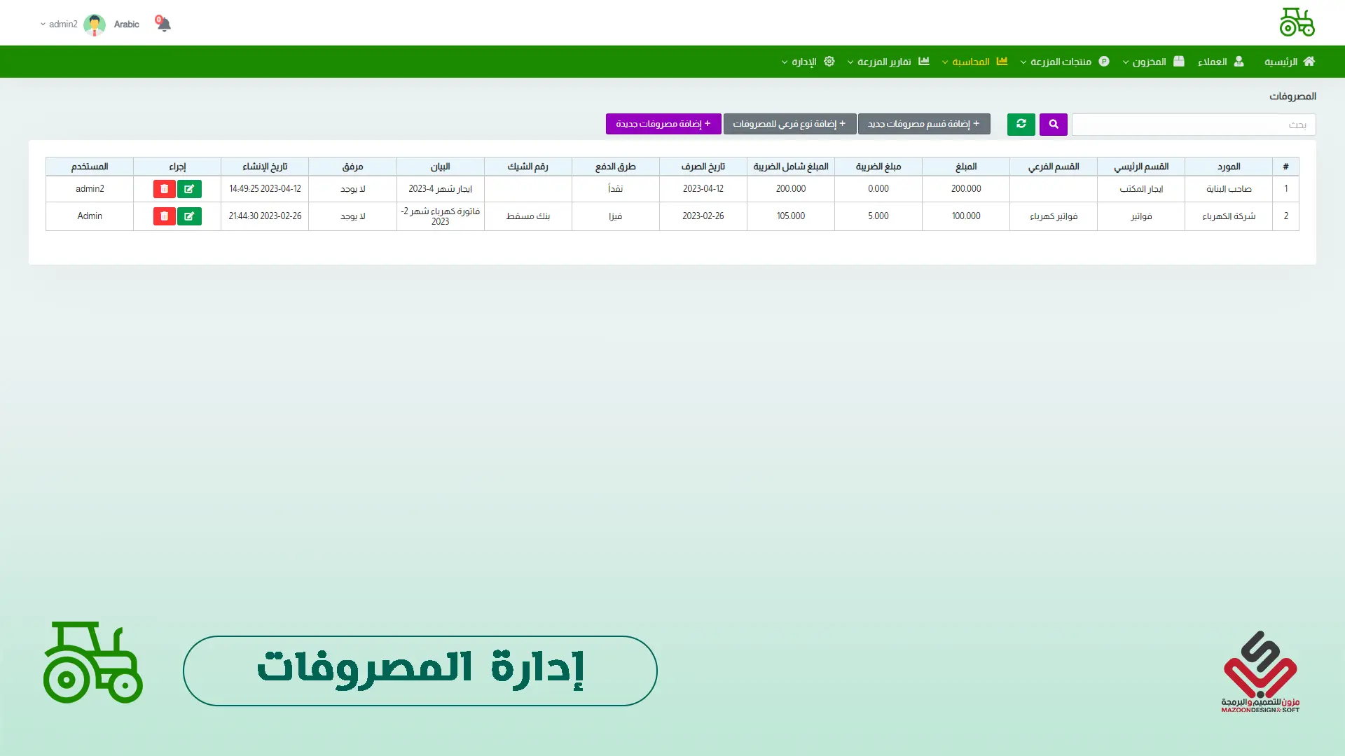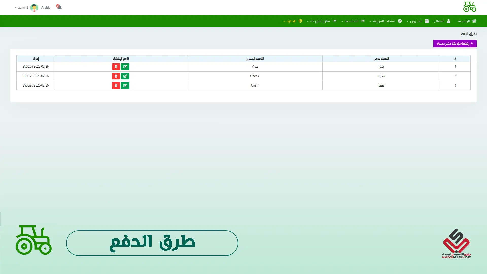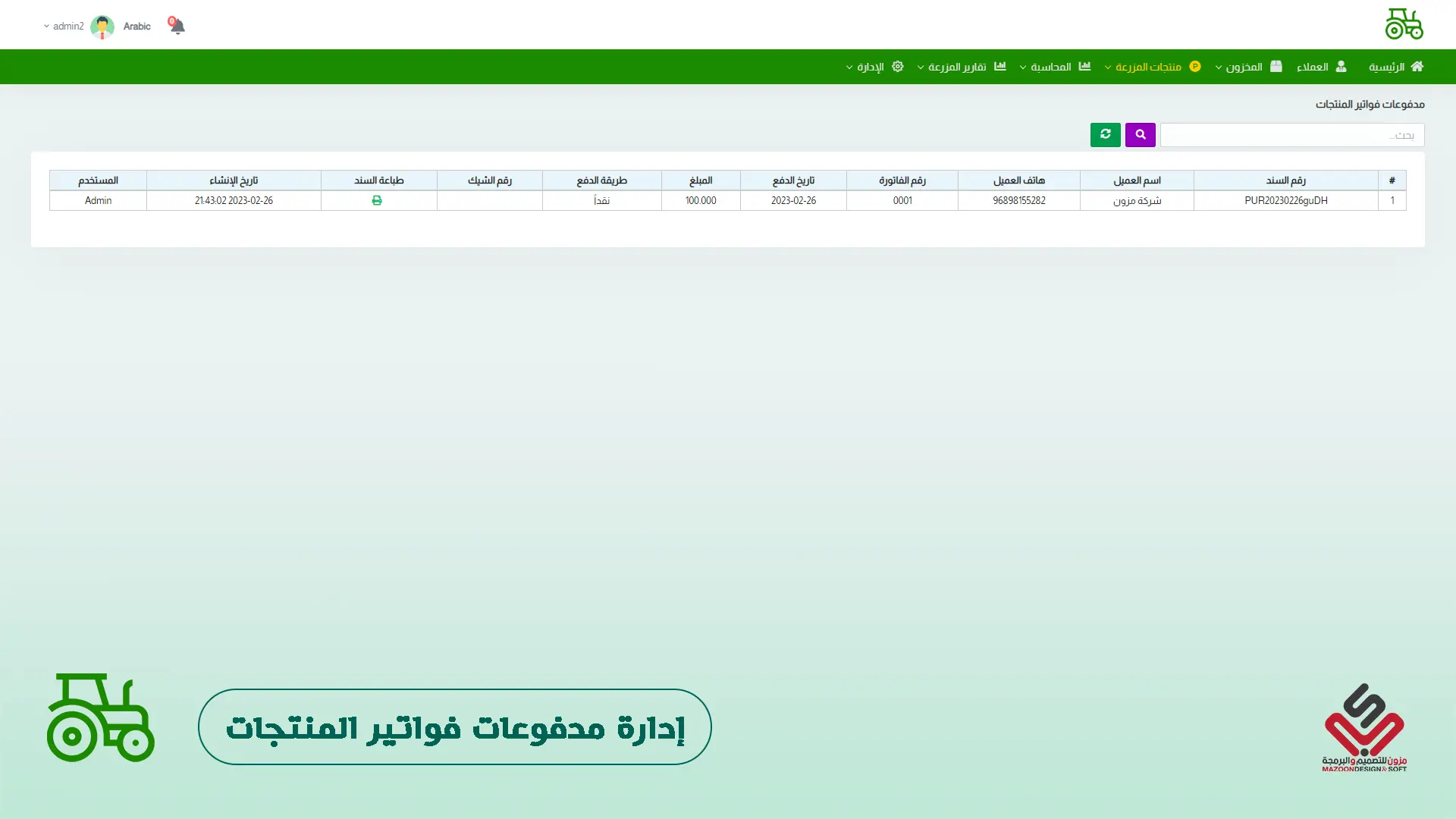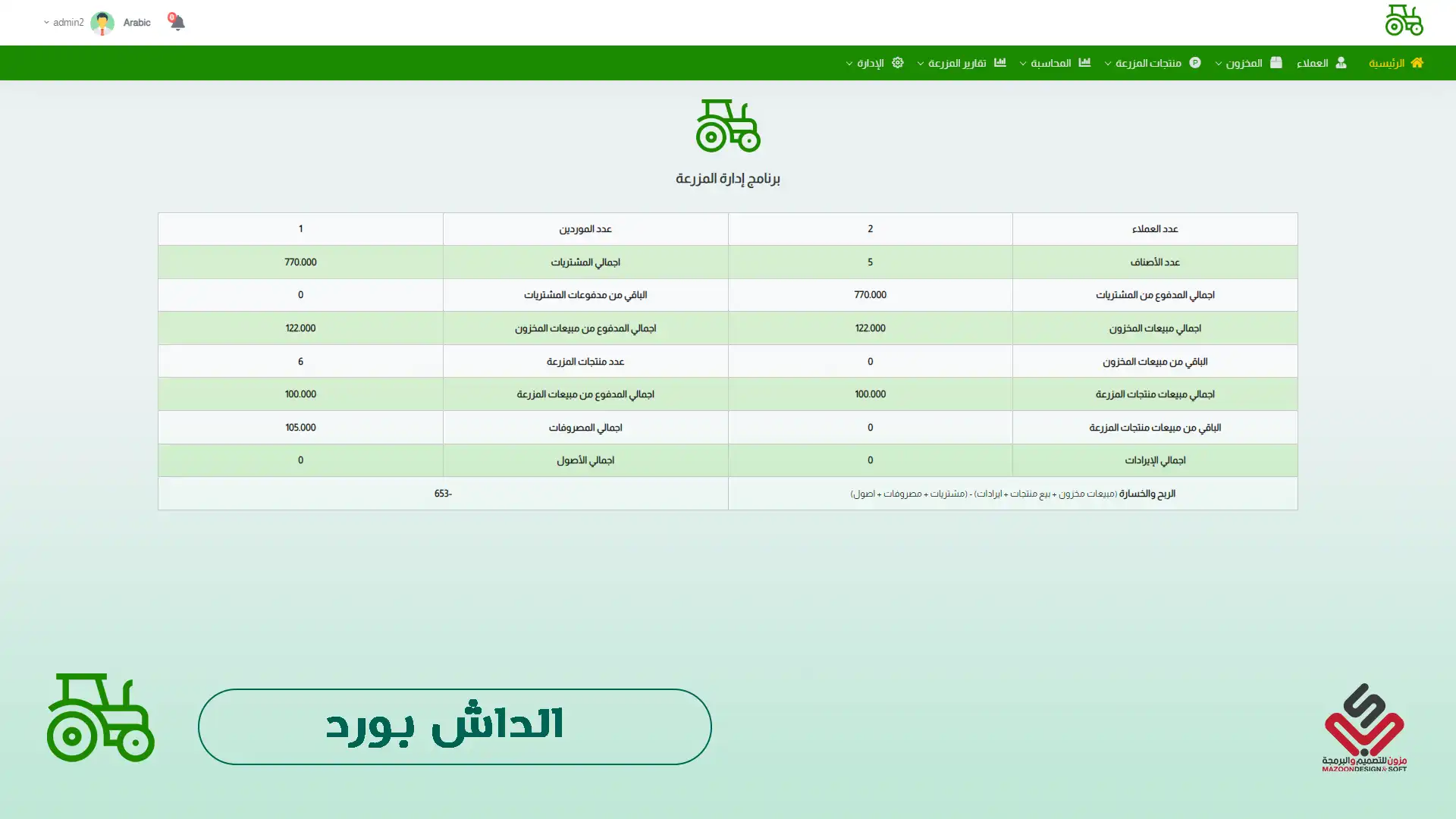 إضافة المنتجات من المزرعة مع الأسعار ، وإضافة مخزون من مشتريات الموردين مع معرفة العدد المتاح وسعر الشراء وسعر البيع مع التنبيهات لعدد معين، والنقص من المخزون في حالة البيع