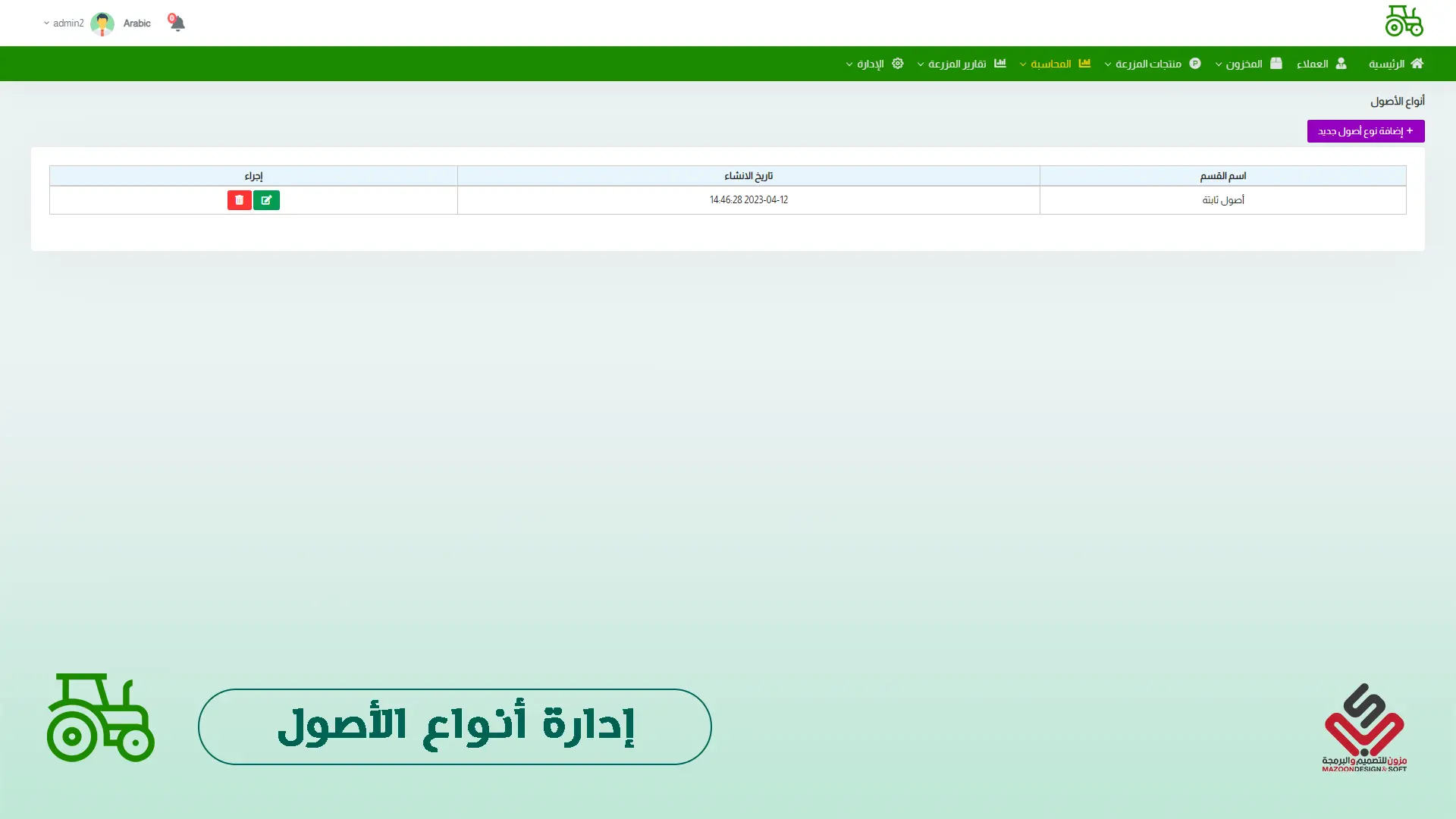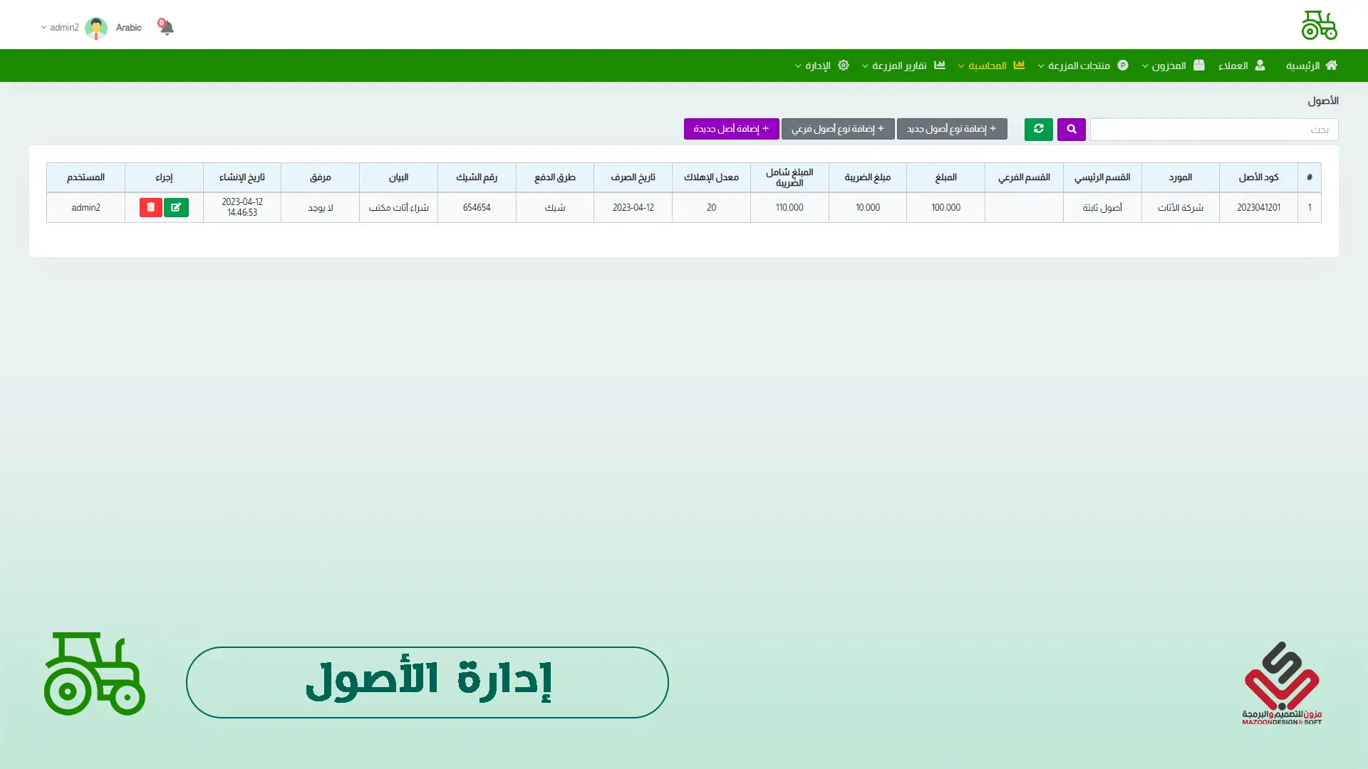 قسم خاص بإدارة أصول الشركة أو المؤسسة ويمكن تقسيم الأصول لأقسام رئيسية واقسام فرعية مع اضافة العديد من الأصول مع نسبة الإهلاك