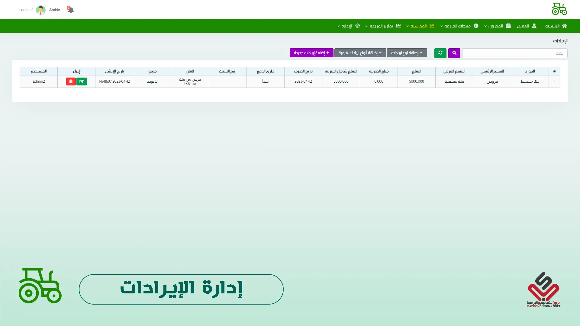 قسم خاص بإدارة الإيرادات والدخل ويمكن تقسيم الإيرادات لأقسام رئيسية واقسام فرعية ويمكن اضافة العديد من موارد الدخل